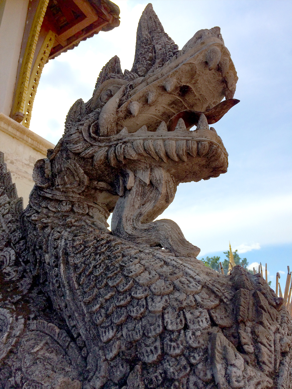There is a very special monument in the centre of Vientiane city – the Patuxay Monument. "Is it the Arc De Triomphe in Paris?" – that was my first impression. While in the form of a western building construction, I found that it was designed to pay homage to the Laotian national culture and traditions. The frescoes on the wall are not stories that eulogize national heroes or winning affairs, but Buddhist mythology. Laotian people are the holy followers of the Hinayana. People relieve and release their souls from purgatory through themselves. Buddhist pagoda and dragons, typical Hinayana symbols, decorate the structure. We notice a dragon, made of stone, standing along the wall. The vivid carving makes the body strong, roaring to the sky.