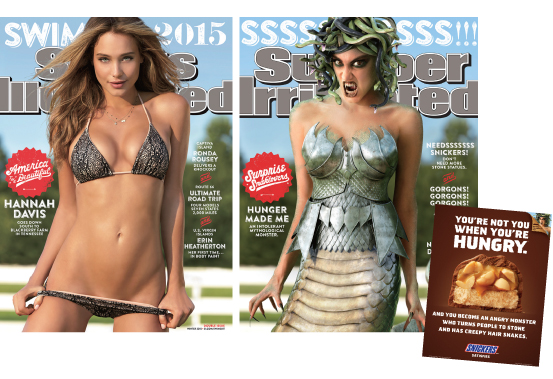 Sports Illustrated understands how front cover bikini-clad models sell magazines – especially in the middle of winter. On the front cover of their 2015 Swimsuit edition, model Hannah Davis appears in the traditional bikini. But the back cover offers a surprise: Teaming up with confectionary manufacturer Snickers®, Hannah reappears dressed as Medusa, a female Gorgon or monster in Greek mythology. Behind her Dracula-like visage, the magazine has recast itself as Super Irritated, though this legend is partially obscured. The lines are: HUNGER MADE ME an intolerant mythological monster, and NEEDSSSSSSS SNICKERS. This kind of unorthodox advertising strategy has drawn critical attention from readers – and industry commentators – around the world.
