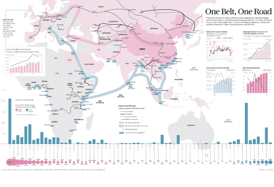 Another analysis is that OBOR is a macroeconomic policy, China's way of exporting itself out of an economic slowdown.12 There is massive overcapacity in steel-making and concrete, so the argument goes. Infrastructure buildout is saturated at home. It is time to "go west", with massive rail, road and bridge projects connecting to the states of Central Asia, and onward to Europe. This overland thrust is complemented by the maritime road along which ports have been constructed in countries such as Sri Lanka, Bangladesh and Pakistan, the so called "String of Pearls" strategy.