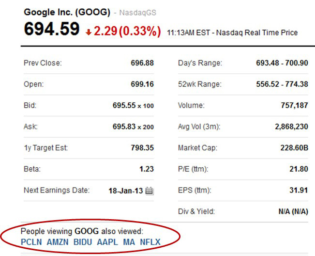 The "also-search" feature of Yahoo! Finance was suspended in May 2015, and this investment opportunity may be privatised. Nevertheless, there are still abundant search data available on other financial portals, for example, Nasdaq.com. Also, aggregate search information is not just limited to financial portals but is also available through e-commerce sites such as Amazon and Taobao. This sort of information may help to forecast customers' demand for consumer goods and related products.