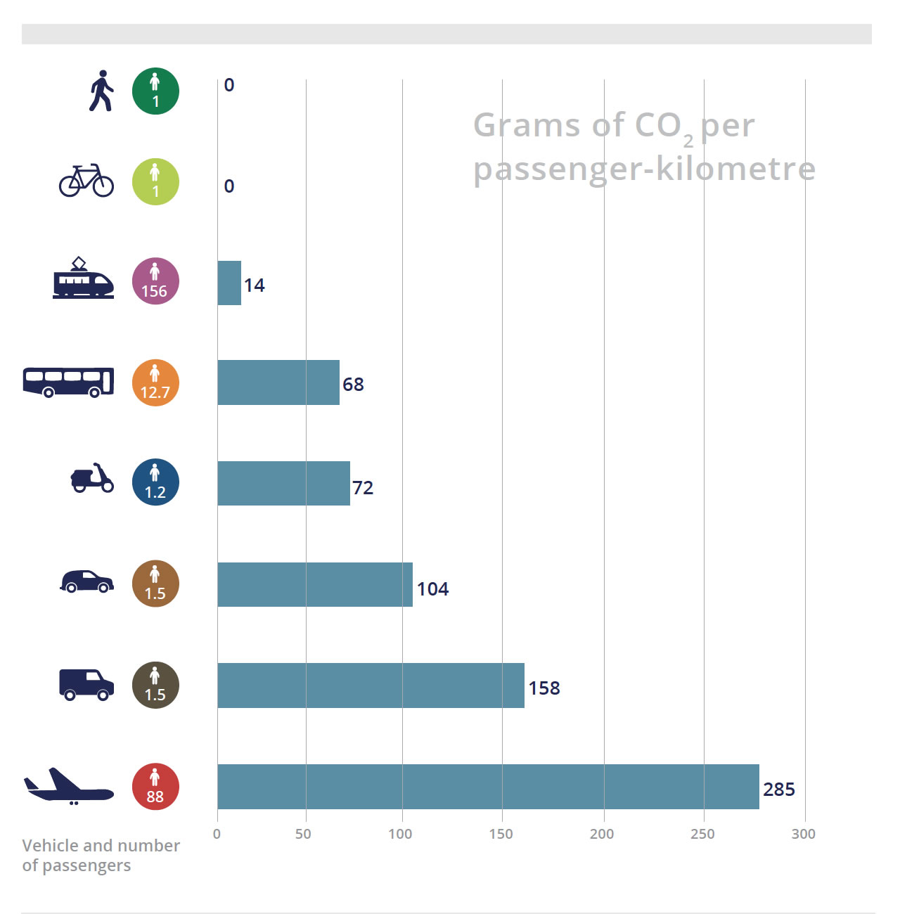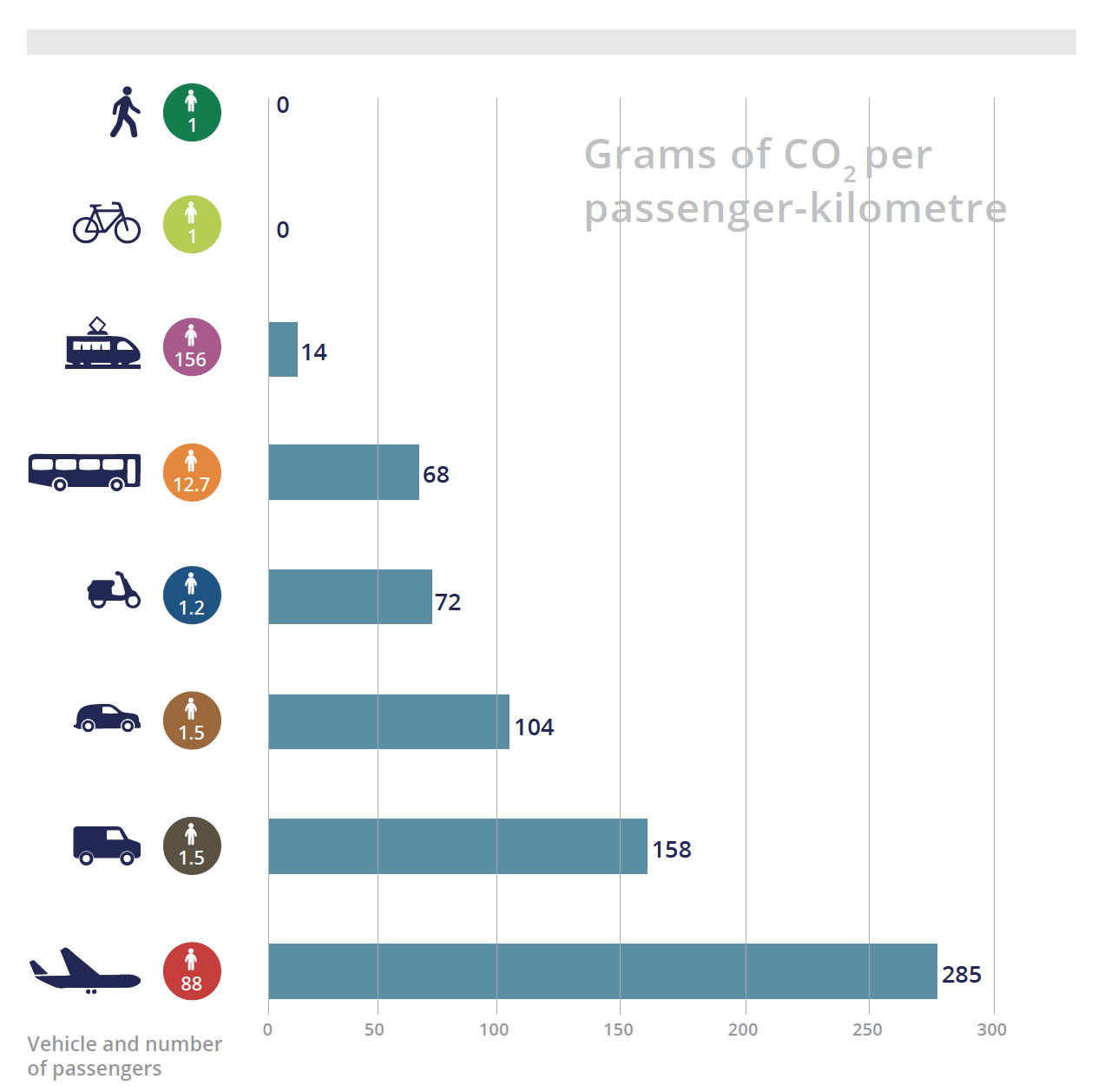 交通工具的選擇眾多,哪一種的廢氣排放量最低,卻並非一目可以瞭然。要衡量每種交通工具對環境的影響,方法之一是量度每位乘客每公里的二氧化碳排放量。