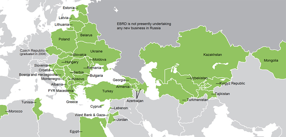 The European Bank for Reconstruction and Development is a multilateral developmental investment bank founded in 1991. The EBRD uses investment as a tool to build market economies. Initially focused on the countries of the former eastern bloc, it has expanded to support development in more than 30 countries from Eastern Europe to Central Asia. Headquartered in London, the EBRD is owned by two European Union institutions as well as 68 countries including China and India. Despite its public sector shareholders, it invests in private enterprises, together with commercial partners. |