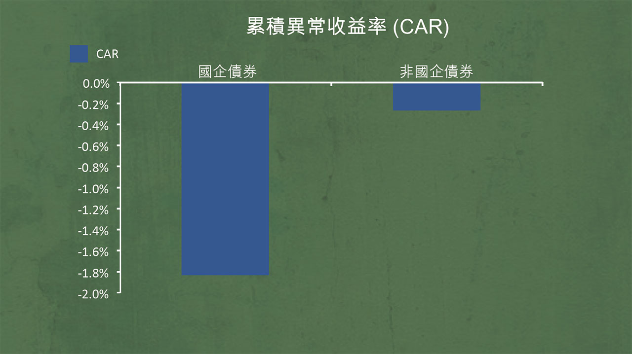 政府撤銷隱性擔保的舉措對企業債券市場造成了很大衝擊。國企債券的價格應聲走低,體現了投資者對此舉措的反應。我們利用國泰安數據庫及萬德資訊提供的數據,發現在天威債務違約前後60天期間,國企債券的平均累積異常收益率相較於非國企債券低了1.53% 。