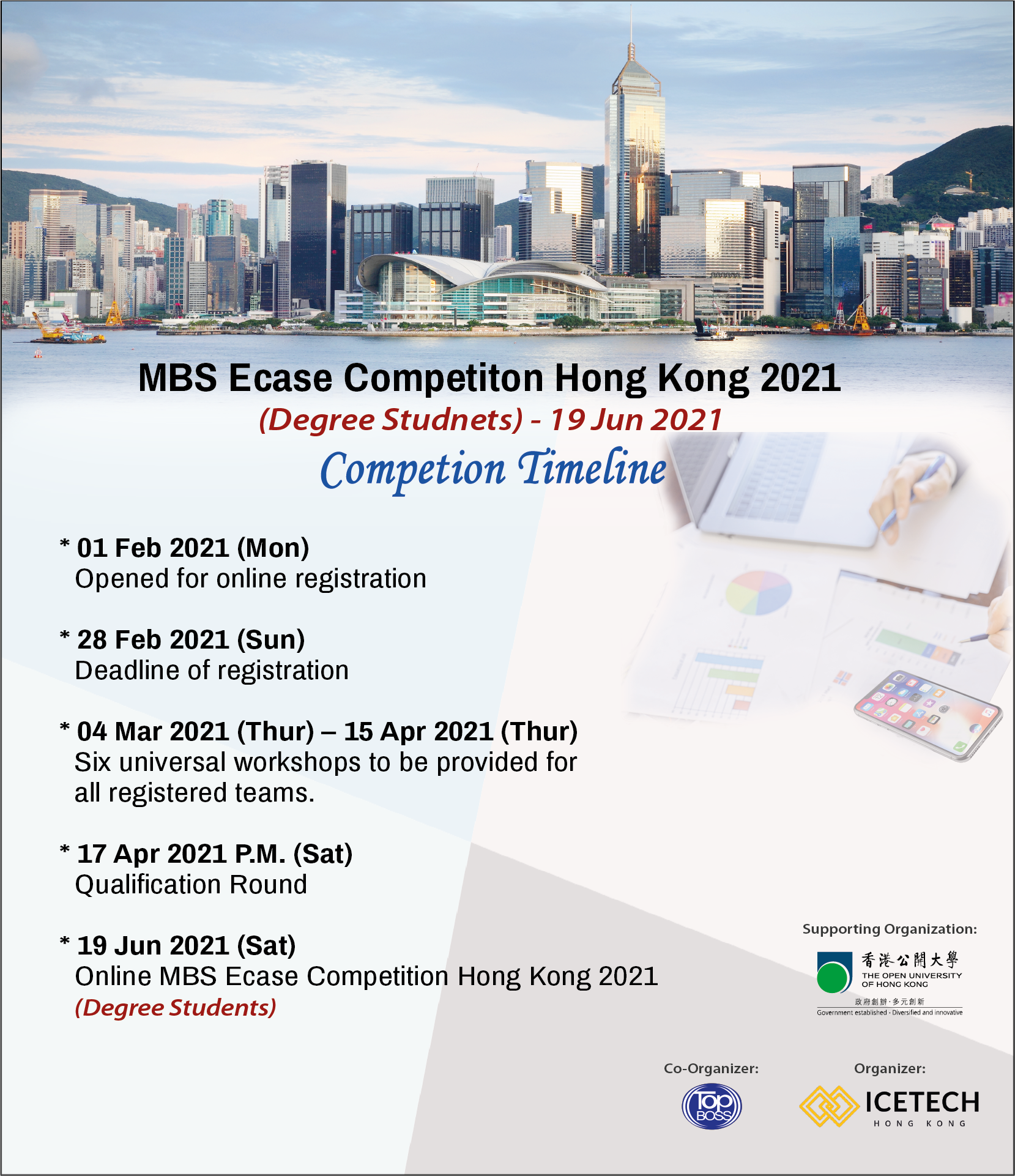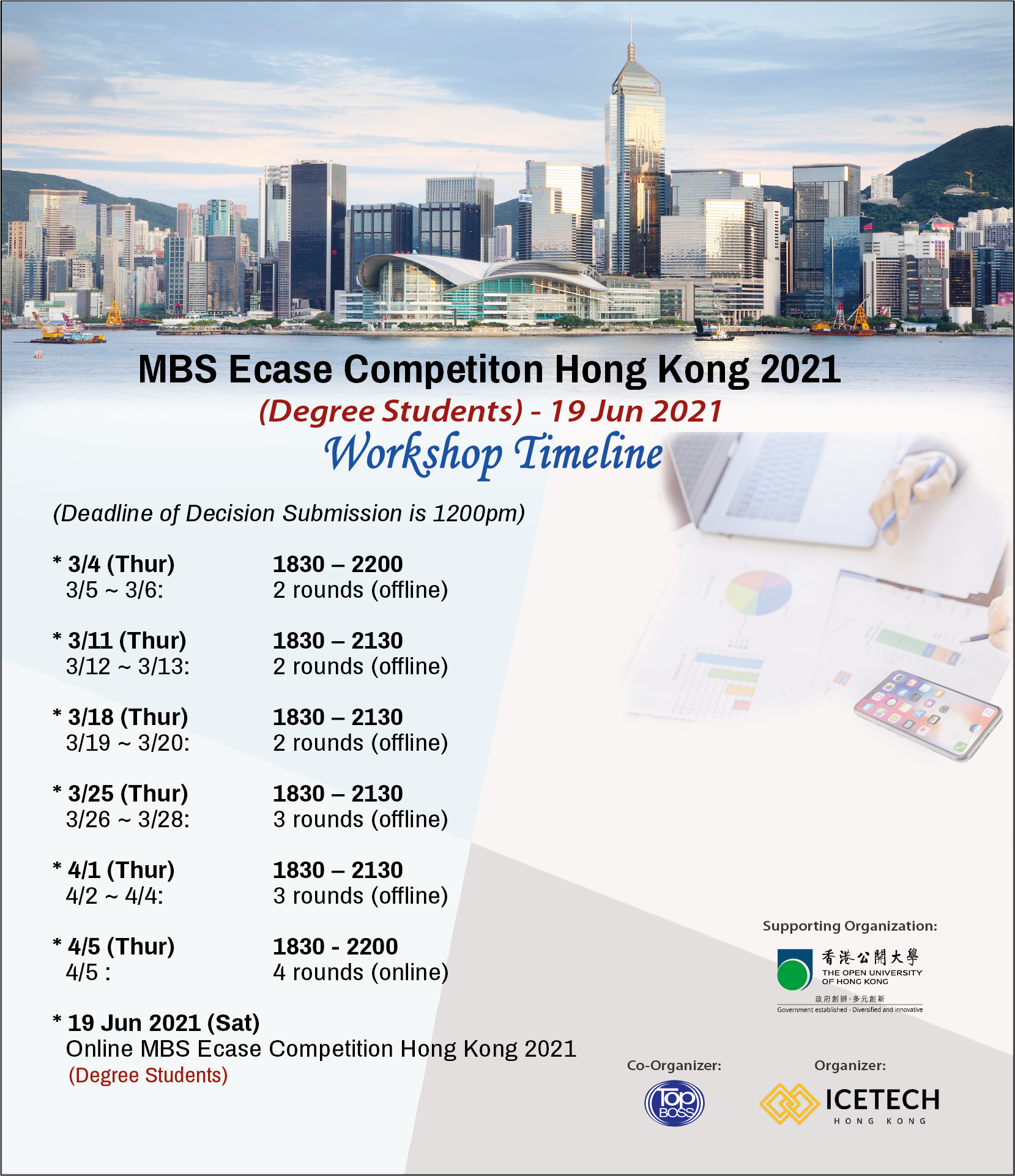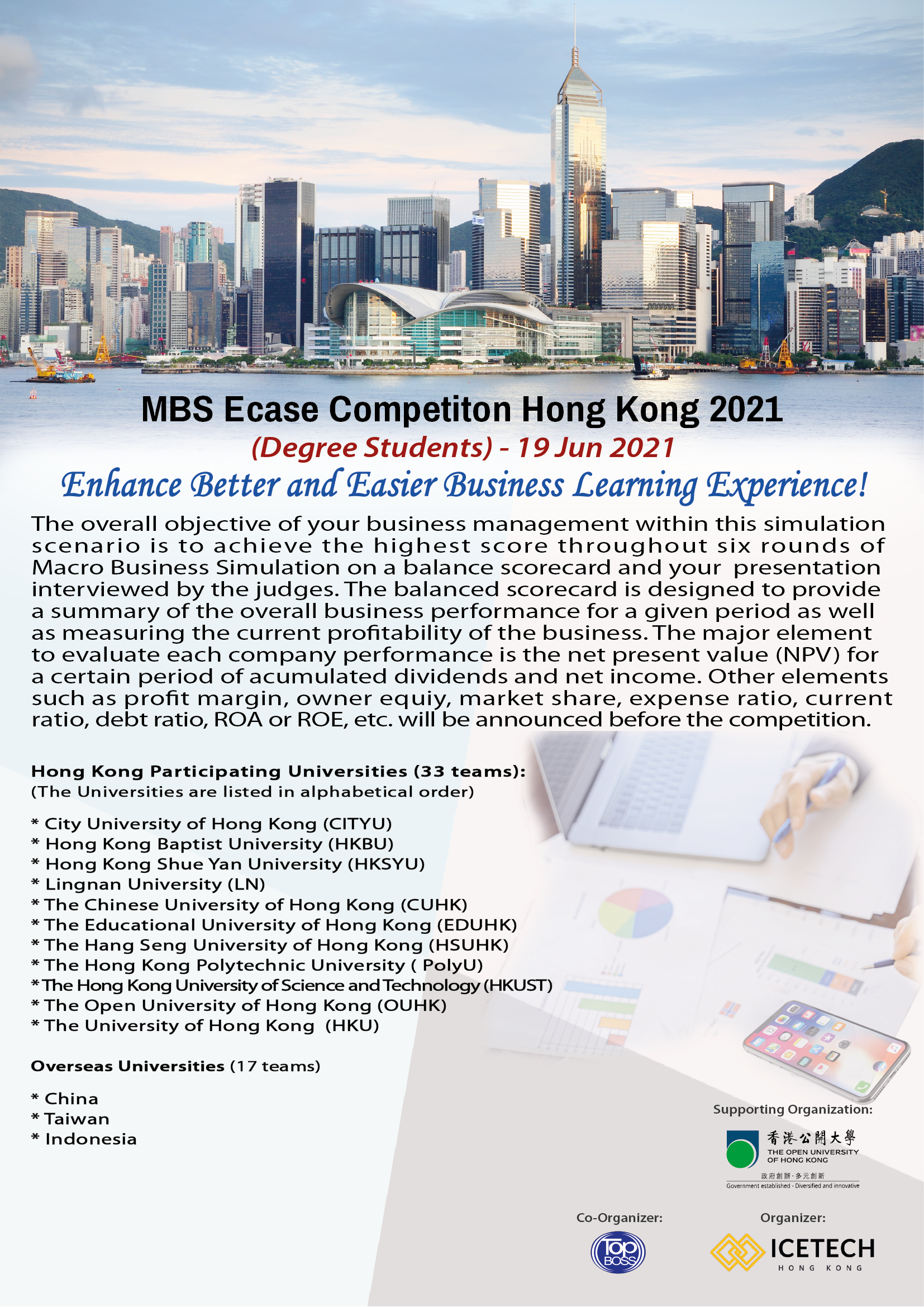With the vision “Enhance Business Learning Experience!” MBS Ecase competition Hong Kong 2021 is organized by Icetech Hong Kong Ltd. to promote self-directed learning with enhanced efforts by team through academic business simulation platform between university students as well as encourages students to address and analysis the key issues on both qualitative and quantitative measurement and identify the feasible solutions in strategic plan and decision to reach the optimal financial performance. MBS (Macro Business Simulation) is the cloud-based platform that provides business management with comprehensive financial reports of which tangible results are delivered in quarterly basis, the simulation creates a competitive environment for students to learn the core business concepts, experiment business strategies and experience the consequences of their actions in a virtual dynamic business environment