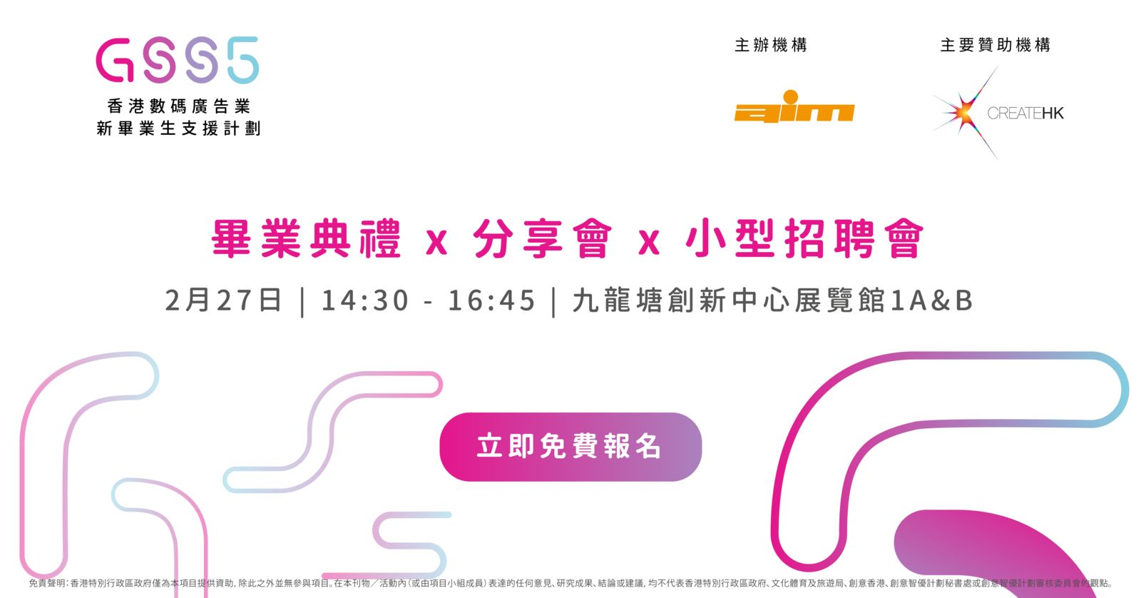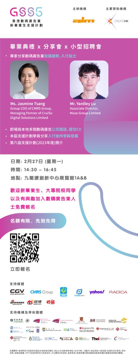 Free of charge Register NOW: https://forms.gle/fo9eW2xGxqCU5NCU6 Organizer: Hong Kong Association of Interactive Marketing Lead Sponsor: CreateHK, The Government of HKSAR Enquiry Email: gss5@hkaim.org Contact no.: 3594 6721 Support scheme website: https://gss5.hkdai.hk/