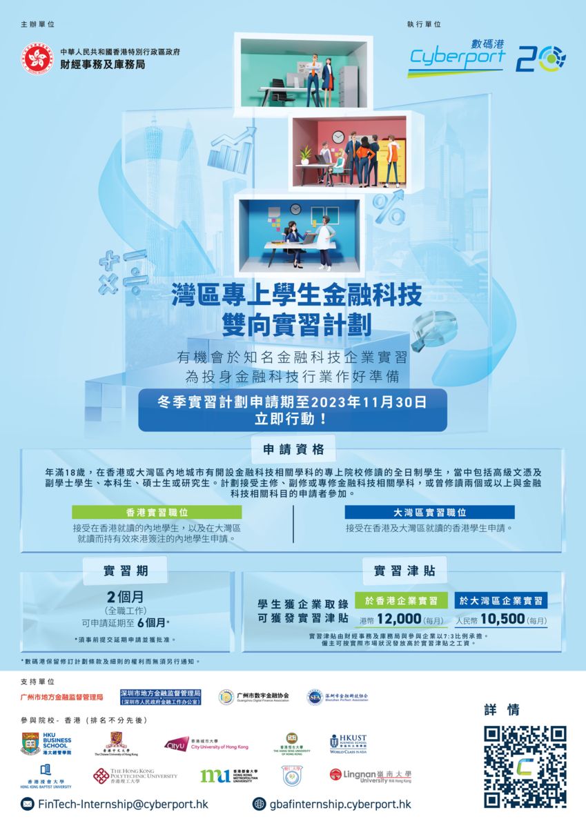 | Details: | The Financial Services and the Treasury Bureau ("FSTB") launched the “GBA Fintech Two-way Internship Scheme for Post-secondary Students” with an aim to enlarge the local Fintech talent pool. It enables post-secondary students who study Fintech Programmes in Hong Kong and in the Mainland cities of the GBA to acquire internship experience in Fintech companies and helps them develop an early interest in pursuing their career in the Fintech field. Application period: Until 30 November 2023 Internship Period: 2 months, extendable to 6 months Eligibility: Applicants could apply for internship positions in Hong Kong and Mainland cities in the Greater Bay Area as follows: 1. Internship positions in Hong Kong – accept applications from Mainland students studying in HK or Mainland cities in the GBA, who hold a valid entry visa, or 2. Internship positions in Mainland cities in the Greater Bay Area - accept applications from HK Students studying in HK or Mainland cities in the GBA Internship Allowance: