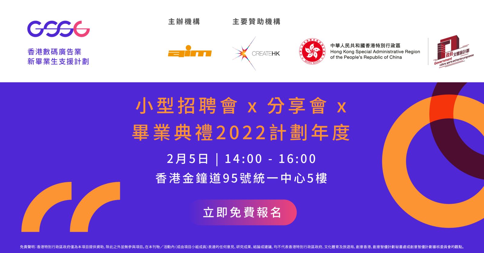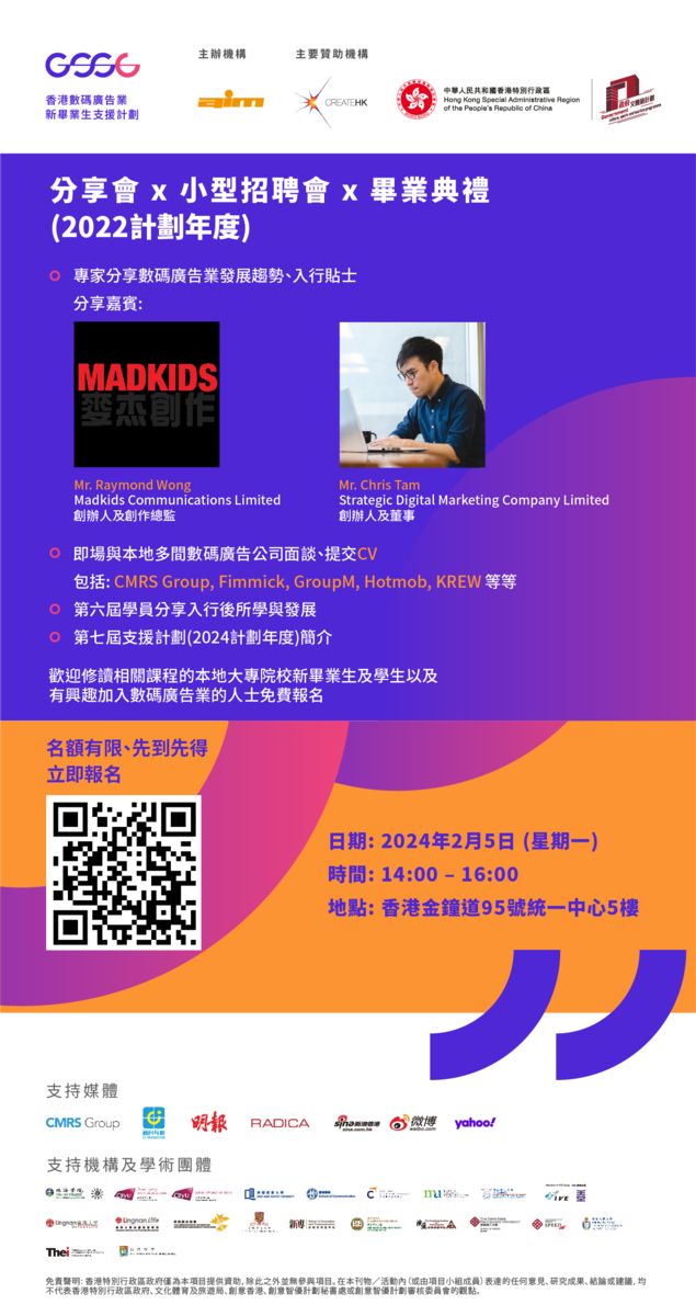 2024年2月5日(星期一) | 14:00 - 16:00 香港金鐘道95號統一中心5樓 歡迎修讀相關課程的本地大專院校新畢業生及學生以及有興趣加入數碼廣告業的人士免費報名 名額有限 先到先得