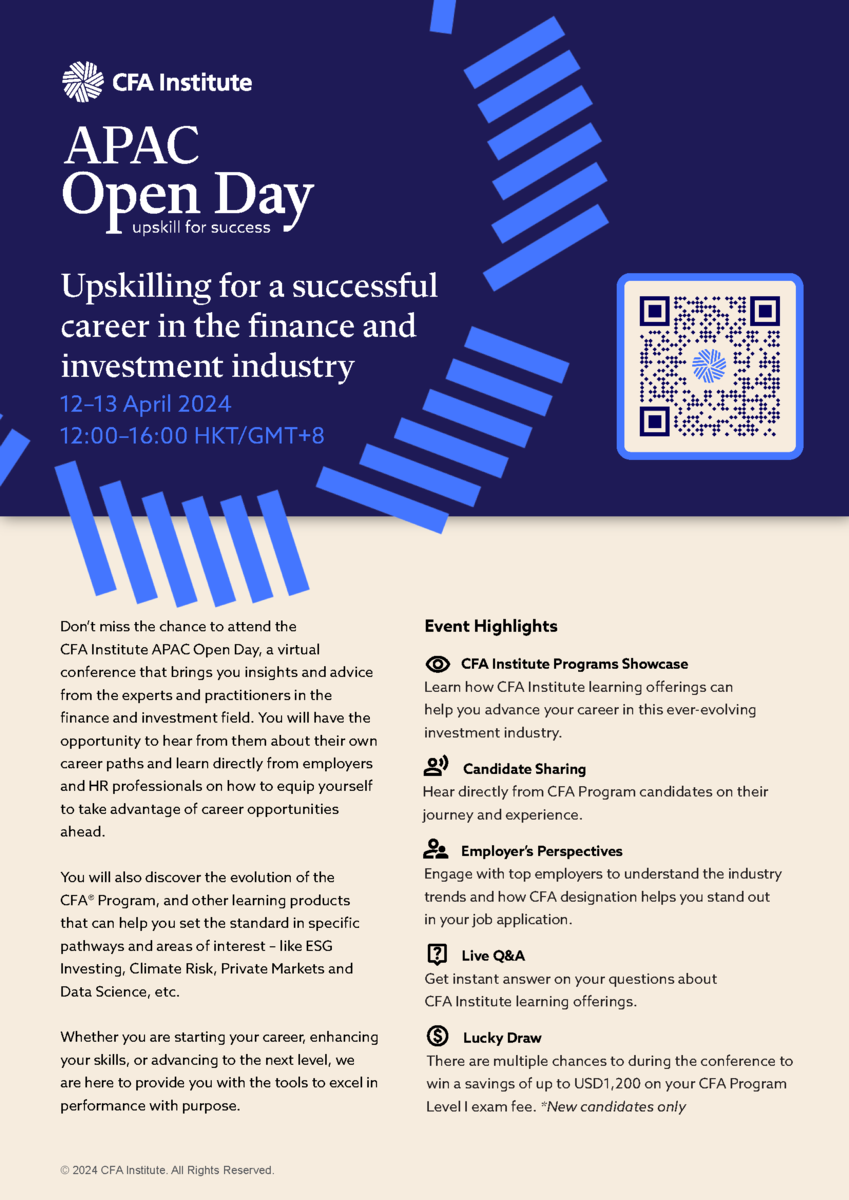 If you are passionate about finance and want to upskill for success, then you won’t want to miss the CFA Institute APAC Open Day, a virtual conference that will connect you with the experts and practitioners in the finance and investment field.