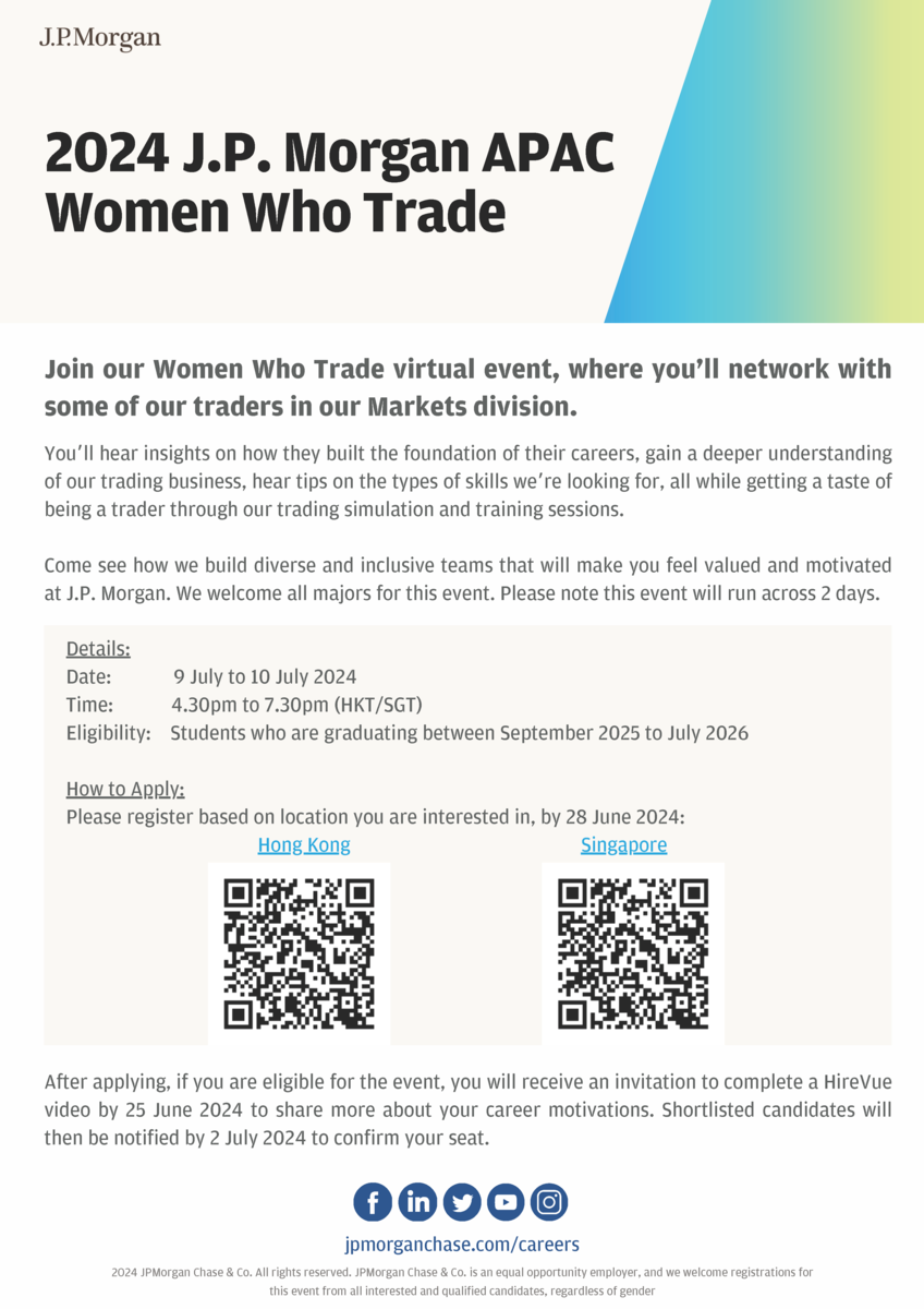Join the Women Who Trade virtual event by J.P. Morgan. All major students graduating (male/female) between September 2025 to July 2026 can apply. Registration link: https://jpmc.fa.oraclecloud.com/hcmUI/CandidateExperience/en/sites/CX_1001/job/210525378 This event is virtual and only eligible students will be invited to complete HireVue by 25 June 2024.