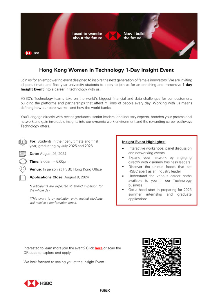 | Details: | HSBC – Hong Kong Women in Technology 1-Day Insight Event HSBC will be hosting an 1-Day insight event, Women in Technology, in late August. You will have an opportunity to engage directly with recent graduates, senior leaders, and industry experts, broaden your professional network and gain insights into the dynamic working environment and the rewarding career pathways Technology offers. Date: 26 August 2024 (Mon) Seats are limited for the event, only invited students will receive a confirmation email closer to event date. |
