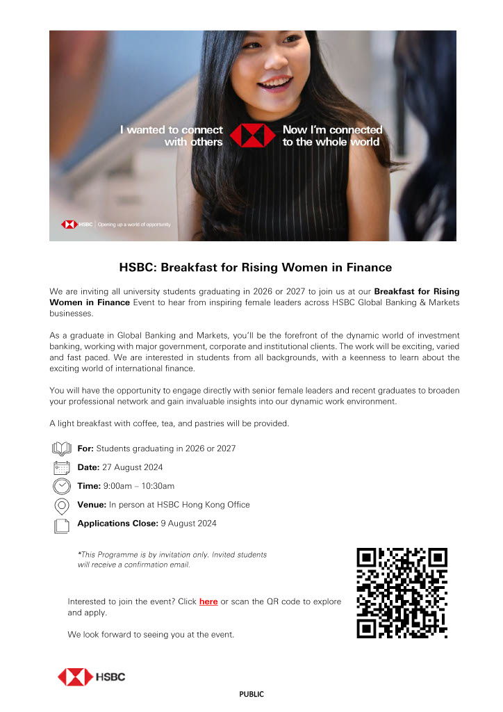 | Details: | HSBC – Breakfast for Rising Women in Finance HSBC is hosting a morning session, providing insights into what a career in Global Banking and Markets at HSBC entails. By joining this event, you will have the opportunity to hear the career journeys and stories of HSBC senior leaders and graduates. You will also have the opportunity to engage directly with industry experts to broaden your professional network and gain insights into their work environment. Date: 27 August 2024 (Tue) Seats are limited for the event, only invited students will receive a confirmation email closer to event date. |