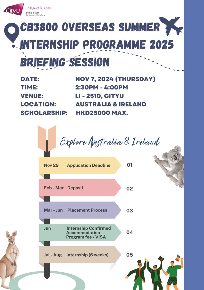 | Details: | In collaboration with Bloom of Youth, College of Business is pleased to announce the launch of CB3800 Overseas Summer Internship 2025. This 3-credit unit course is designed to provide Year 2 and Year 3 students with hands-on experience in overseas business contexts during Summer 2025 (July – August). Join the briefing session to understand more about the summer internship opportunities in Australia and Ireland, application procedures, program details and also subsidies available (by nomination only). Please refer to the following E-poster for more details and register via CRESDA. Date: Nov 7, 2024 (Thursday)