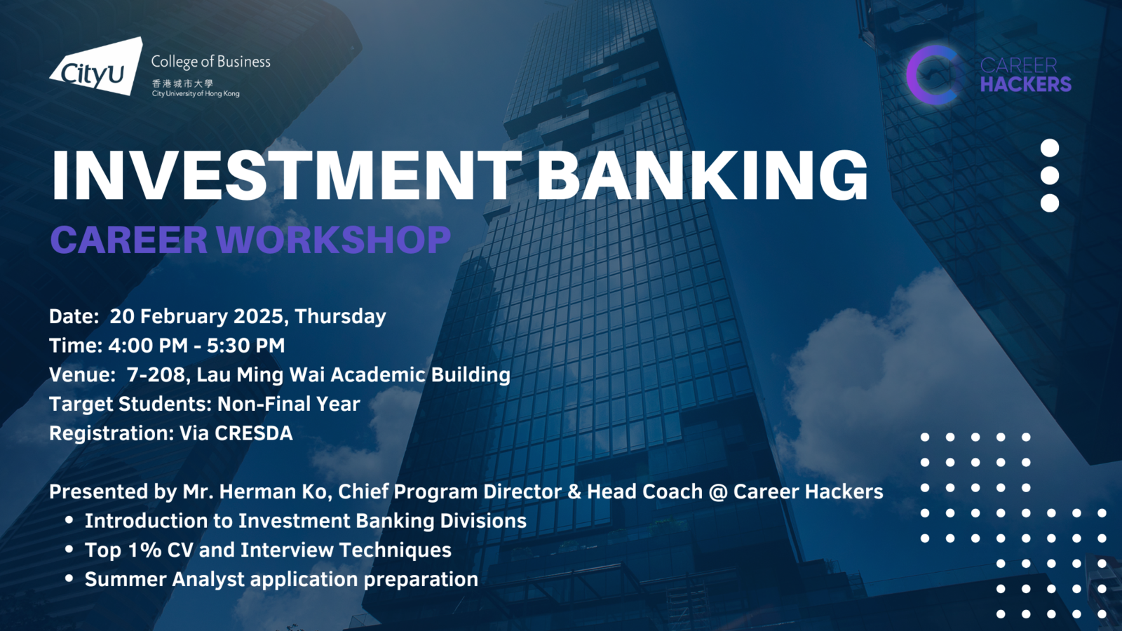 | Details: | Presented by Mr. Herman Ko, Chief Programme Director & Head Coach, Career Hackers An informative workshop for students to get a full picture of the career prospects in investment banking and high finance; the latest career landscape, key hiring requirements and career planning roadmap. Date: 20 Feb (Thu) Target Students: CB UG Year 1 and 2