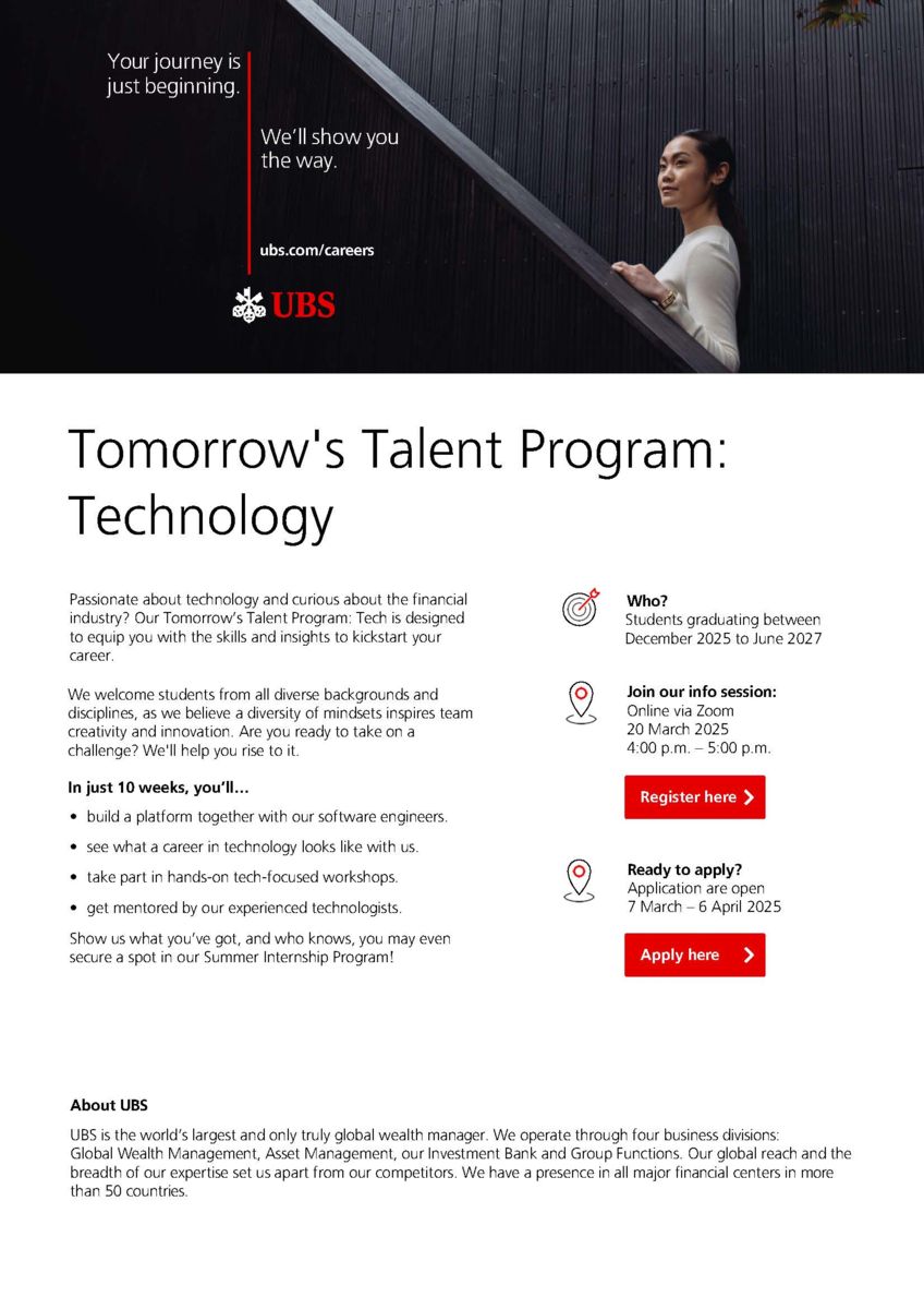| Details: | UBS is launching the Tomorrow’s Talent Program: Technology for students who wish to start a career in the tech field. In the 10-week mentorship, students will be guided by a software engineer mentor in building a platform and get trained in hands-on technical workshops. This is a great opportunity to make the first step into the industry, where participants will gain hands-on experience and valuable insights from industry experts. Successful candidates might even secure a 2026 summer internship spot. Targets: Students graduating between December 2025 to June 2027 Virtual Info Session Date: 20 March 2025 (Thu) Applications will be screening on rolling basis, so do send in your applications to UBS HERE early. |