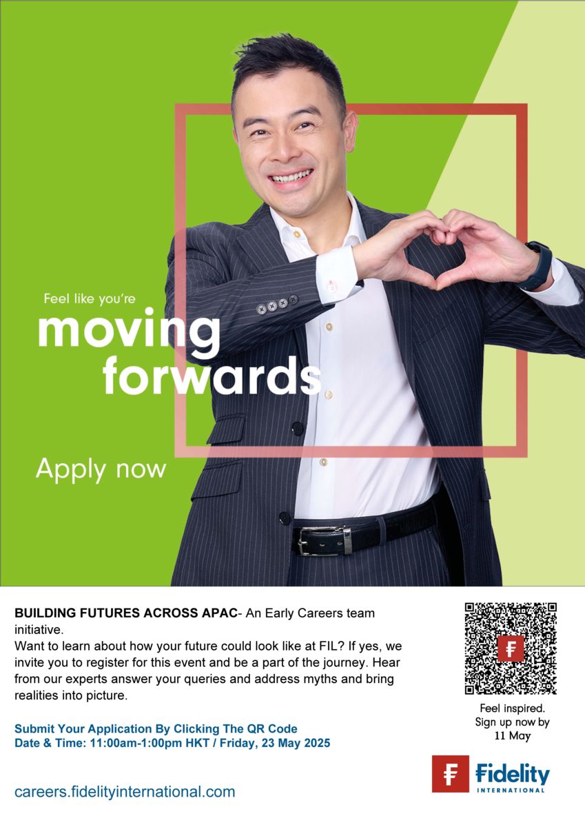 | Details: | Fidelity International is organizing an insight event for students who are keen to learn more about the Investment Management industry. This virtual event will be an introduction to Fidelity and the career opportunities available within the business and the industry. You will also have opportunities to hear from the experts, answer your queries and address myths and build a picture of what your future could like at Fidelity. Date: 23 May 2025 (Fri)