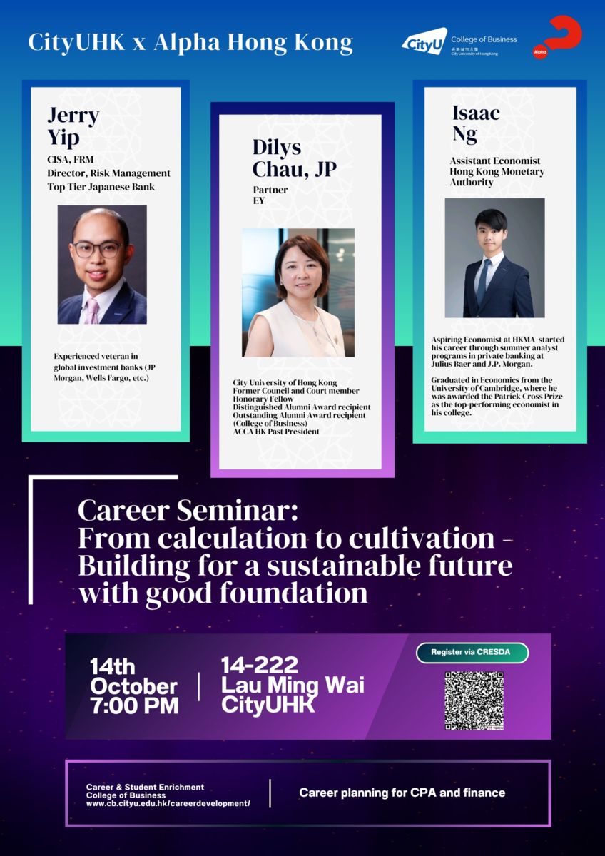 The Career Seminar: From calculation to cultivation - Building for a sustainable future with good foundation will be held on 14 Oct. Participate to gain valuable insights for your career planning in CPA and finance.