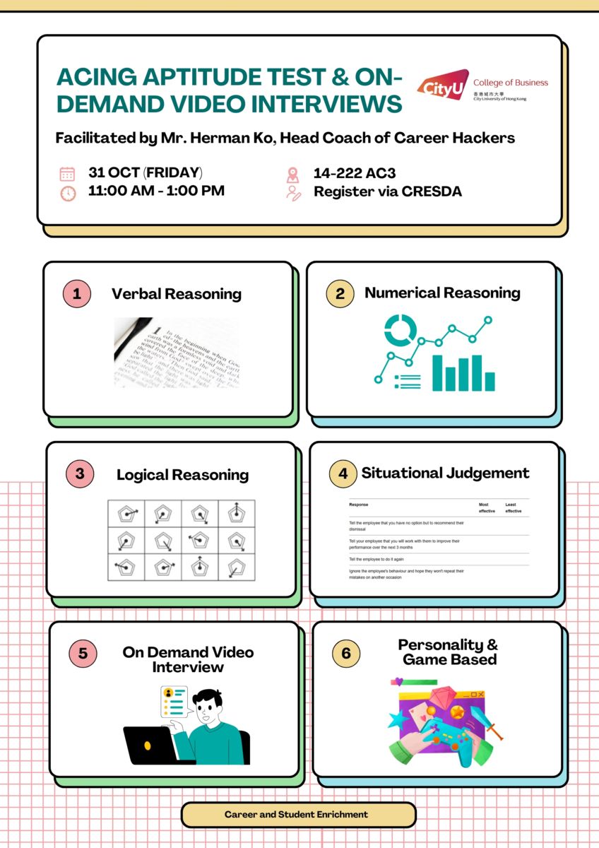 | Details: | Career Workshop - Acing Aptitude Test and On-Demand Video Interview Date: 31 October 2025 (Friday) Aptitude Testing (aka. Ability Test/Online Test/Assessment) plays a significant role in the job application process. It is the fastest way for employers to assess a student’s logical reasoning, time management, decision making, personality fit and verbal & non-verbal English presentation skills in ONE quick test.