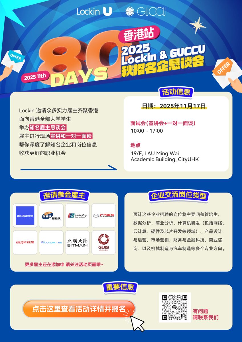 | Details: | Lockin has invited numerous prominent employers to gather in the City University of Hong Kong on 17 November 2025, sharing their upcoming available positions and providing you with the opportunity to engage in one-on-one discussions with recruitment representatives from these esteemed companies. The positions mainly include Management Trainee, Data Analysis, Business Analysis, Computer R&D, Product Design and Operation, Marketing, Finance and Financial Technology, Business Consulting, Mechanical Manufacturing, Automotive Manufacturing, and other fields. More to come, stay tuned! Participating Employers: