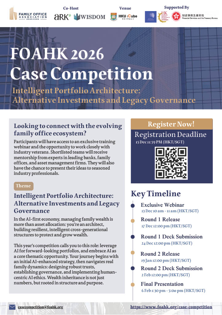 FOAHK 2026 Case Competition provides an opportunity for students to gain insights into the growing family office industry and the trends in alternative investments and legacy governance in Asia. Through the case competition, students can discover what it takes to work in a multi-family office, especially in building resilient cross-generational wealth structures. Participants will have access to an exclusive training webinar and the opportunity to work closely with industry veterans. Shortlisted teams will receive mentorship from experts in leading banks, family offices, and asset management firms. They will also have the chance to present their ideas to seasoned industry professionals