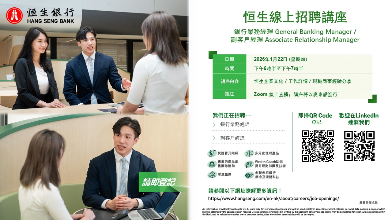 | Details: | You are cordially invited to Hang Seng Virtual Recruitment Talk for General Banking Manager (GBO) and Associate Relationship Manager (ARM). This is an opportunity to get to know about the role and the career growth opportunities available within Hang Seng. During the talk, you can get yourself updated with the news of the branch network presented by Hang Seng’s Business Representative from the Retail Distribution, and hearing the firsthand experiences from existing GBO, Platform Sales Manager and Team Head who will share their personal journeys and success! You may also ask your questions during the talk. Date: 22 Jan 2026 (Thu)