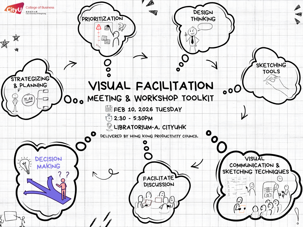 A practical job skill workshop tailored for all CB students. Visual facilitation is a technique that uses visual elements to enhance communication, collaboration, presentation and mutual understanding during group communication. A skill that is widely used at meetings, group work discussions, competition, presentation, sales pitch, assessment center interview and at our daily work. It involves the use of drawings, diagrams, charts, and other visual aids to help participants engage with the content, clarify complex ideas, and foster creativity. It is widely adopted across various industries and roles, particularly in settings that require collaboration, creativity, and effective communication.
