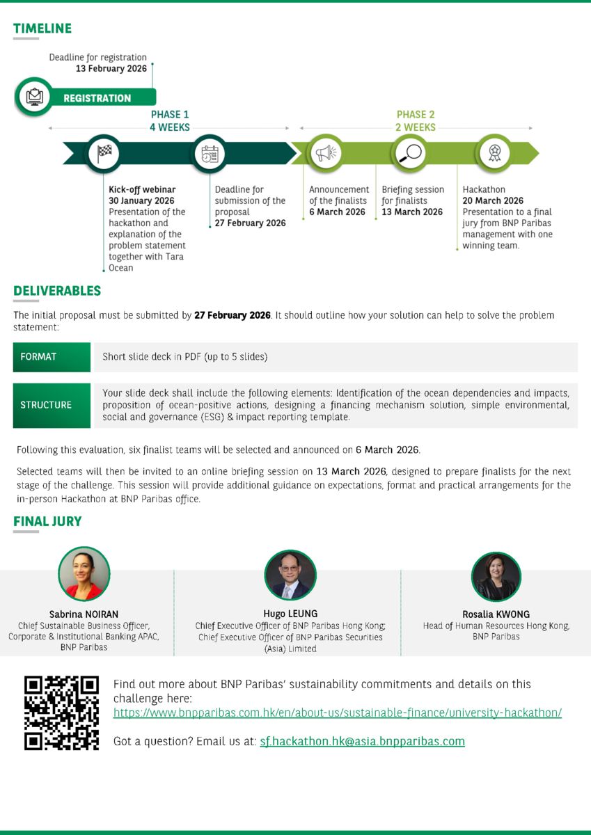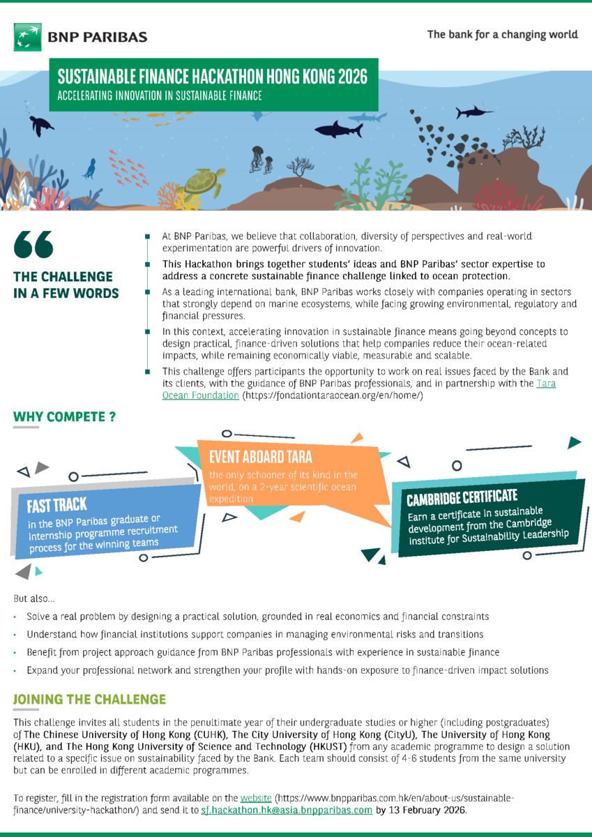 BNP Paribas is inviting all penultimate year undergraduates and postgraduate students from any academic programme to join their second edition of the BNP Paribas Sustainable Finance Hackathon Hong Kong 2026.