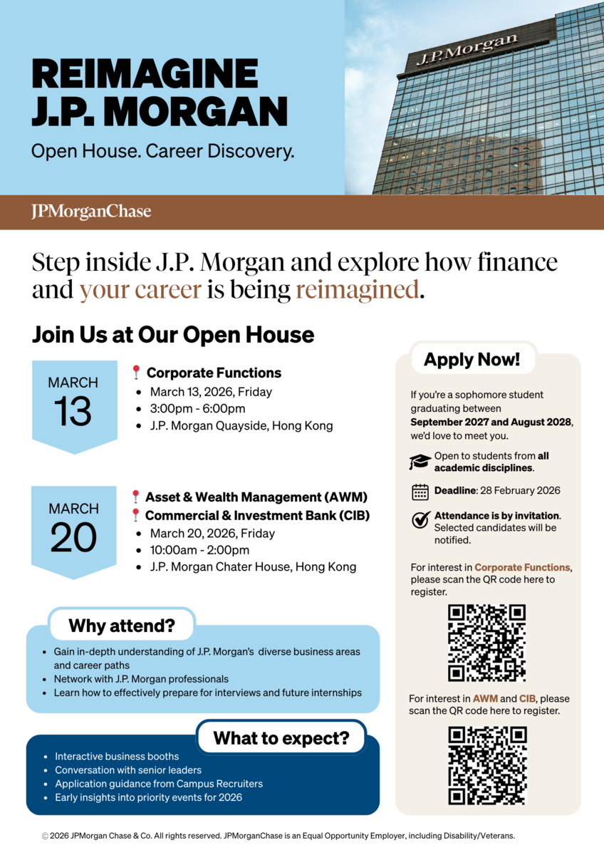 | Details: | J.P. Morgan’s very first Open House event, “Reimagine J.P. Morgan.” will be held in March 2026. This is a unique chance for students to visit their offices, meet the teams, and get a real feel for life at J.P. Morgan. The event will take place on 13 and 20 March and will feature business booths, interactive workshops, fireside chats with senior leaders, and networking with alumni. Who’s Invited?