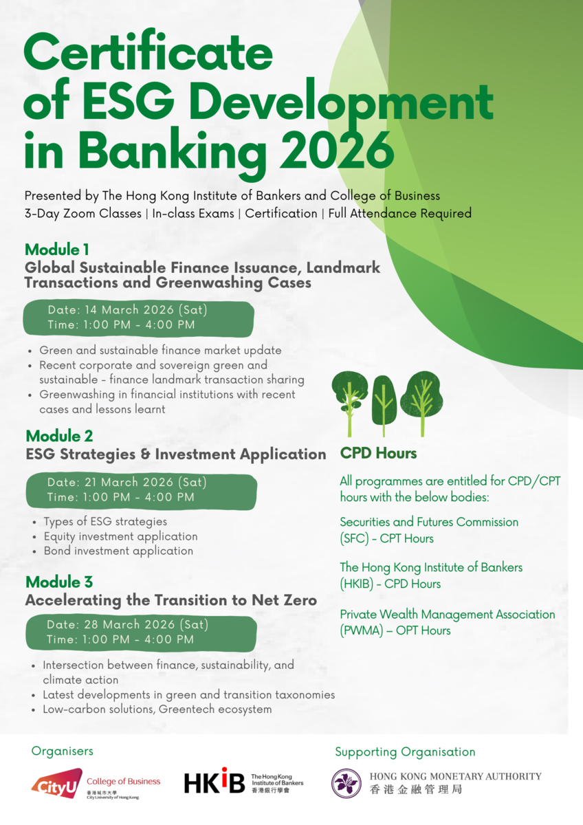 The Hong Kong Institute of Bankers (HKIB) is the first professional body providing banking specific training and certification/qualification services to the banking community in Hong Kong that are recognized by the industry. With the increasing demand in ESG talent from the job market, College of Business is pleased to collaborate with HKIB for the 5th consecutive year in customizing professional certifications tailormade and exclusive for our business students. Interested students may refer to the programme leaflet for the module outline.