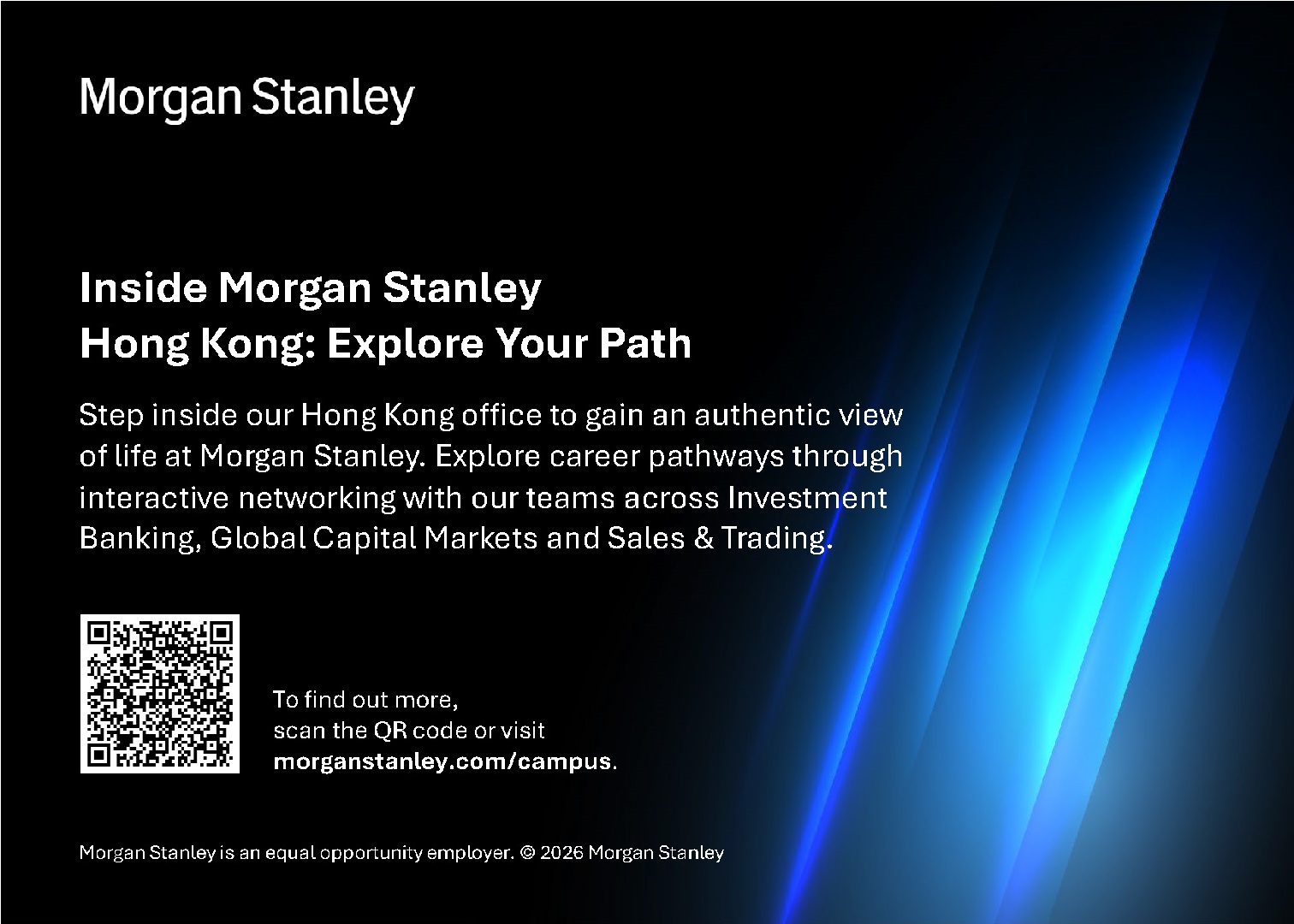 | Details: | Inside Morgan Stanley Hong Kong: Explore Your Path At Morgan Stanley, our people are our greatest asset. We are committed to fostering a culture where you can grow through apprenticeship, challenge yourself with meaningful work and make an impact from day one. This event offers an exclusive opportunity to experience those values firsthand. Explore career pathways across Investment Banking, Global Capital Markets and Sales & Trading, while learning how our culture of collaboration, continuous learning and client-focus shape the way we work. Step inside our Hong Kong office to gain an authentic view of life at Morgan Stanley. Through interactive networking sessions and conversations with our teams, you will deepen your understanding of what it means to build a career at a firm driven by rigor, humility, partnership and a shared commitment to excellence. Event Overview You will hear from our Analysts during a From Desk to Deals panel session, offering insights into day‑to‑day life within our Revenue Divisions and the skills, competencies and interests that contribute to success. Following the panel, you will have the opportunity to connect with Morgan Stanley representatives through interactive networking, enabling you to build your professional network and gain practical insights to support your career exploration. Date: 23 April 2026 (Thursday) Who is this for? University students who are: