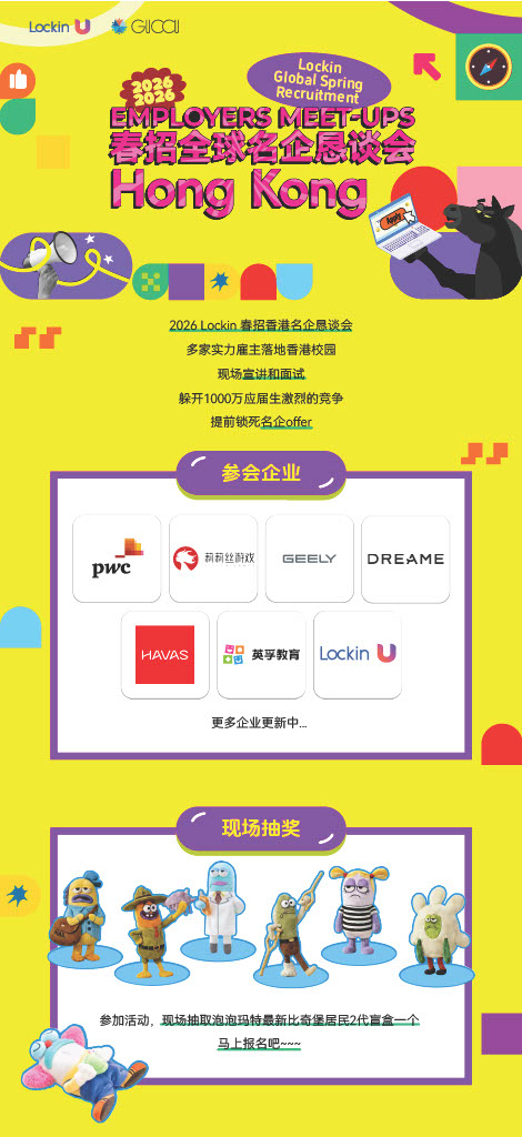 2026 Spring China Employer Meet-ups at CityUHK Lockin has invited numerous prominent employers to gather in the City University of Hong Kong on 14 April 2026, sharing their upcoming available positions and providing you with the opportunity to engage in one-on-one discussions with recruitment representatives from these esteemed companies. The participating enterprises will cover industries in new energy, Internet, electronics, gaming, education, and consulting. More to come, stay tuned! Participating Employers: