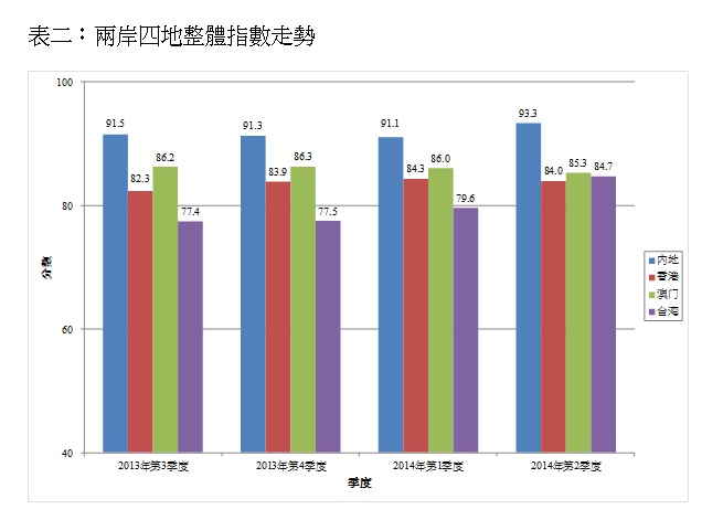 將2014年第二季度兩岸四地的消費者信心互相比較,可見中國內地的信心最高(93.3分),其次是澳門(85.3分),隨後是台灣(84.7分),而香港的信心最低(84.0分)(詳見表二)。