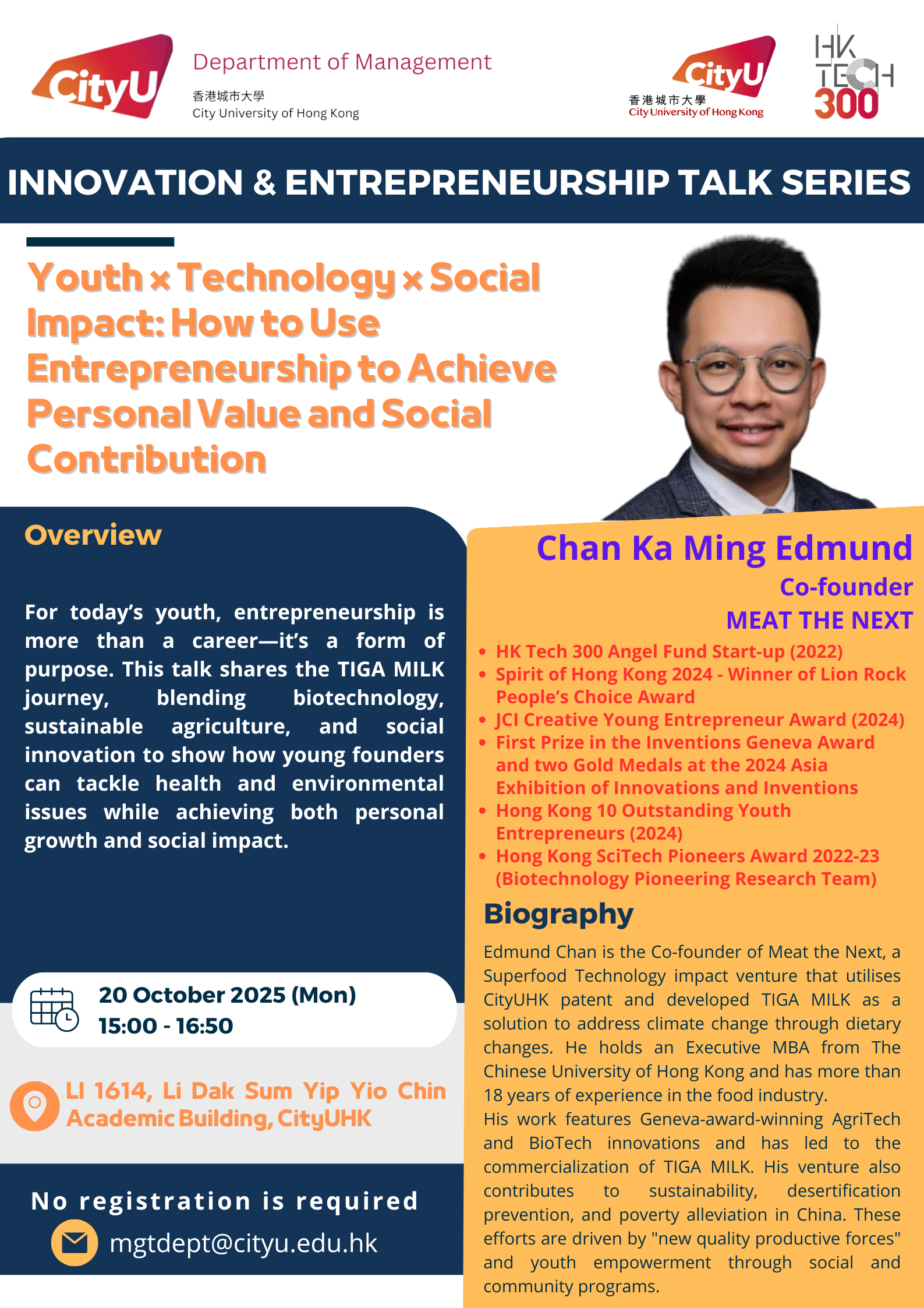 [Innovation and Entrepreneurship Talk Series] Youth × Technology × Social Impact: How to Use Entrepreneurship to Achieve Personal Value and Social Contribution by Mr. Edmund Chan