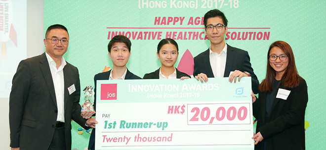 Students from different majors: Jeremy Leung Ka-ming, BBA Information Management, Rica Ng Chak-lam, BEng Information Engineering and Thomas Tse Ho-yin, BBA Marketing, teamed up with Grayson Ho Yik-chung from the University of Hong Kong, and Michelle Lee Wing-yu from the Hong Kong University of Science and Technology, won the 1st runner-up in the JOS Innovation Awards 2017-2018. Their winning project was “Algotritionist”.