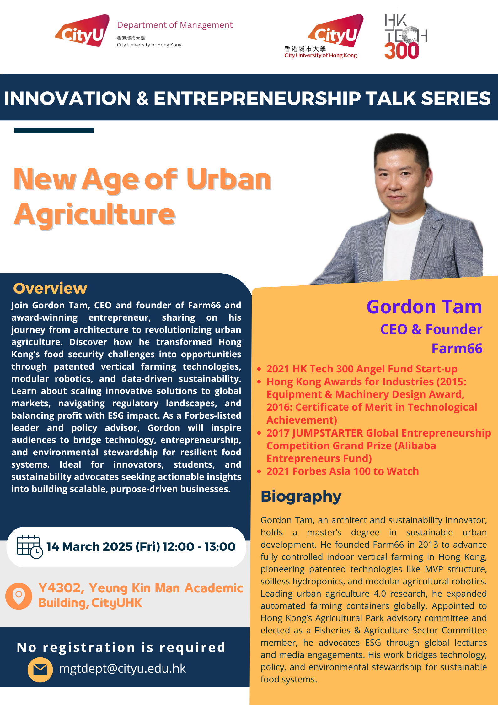 [MGT Talk Series 2024-25 (9)] New Age of Urban Agriculture by Mr. Gordon Tam, CEO & Founder of Farm66