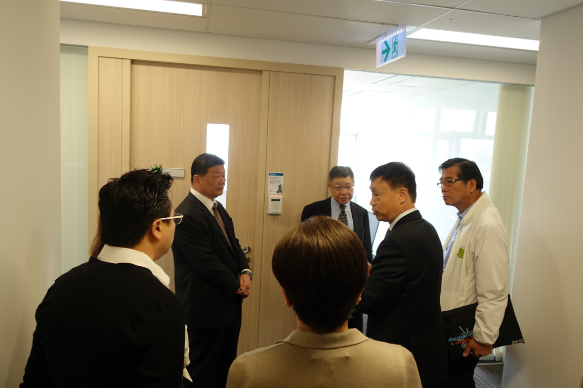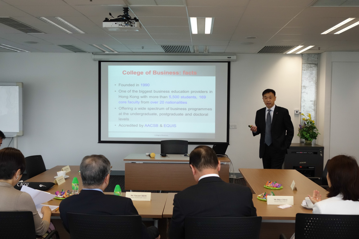 Prof Houmin Yan, Dean of CB, accompanied by the College’s Management Team, Prof Wenyu Dou, Associate Dean of CB (Graduate Programmes), Prof Julie Li, Associate Dean of CB (Undergraduate Programmes), Dr Mary Pang, Associate Dean of CB (Internationalization), Ms Hermia Chiu, College Secretary, and Department Heads of CB’s six academic departments welcomed Mr Herman Hu, BBS, JP, Council Chairman, Mr Vincent Chow, BBS, JP, Deputy Council Chairman, Ms Dilys Chau, External Council Member, Ms Lilian Chiang, External Council Member,  Mr Ho-wah Mak, Elected staff member on Council, and Mr Clovis Lau, Chairman of the Convocation, at the College Office at Academic 3.