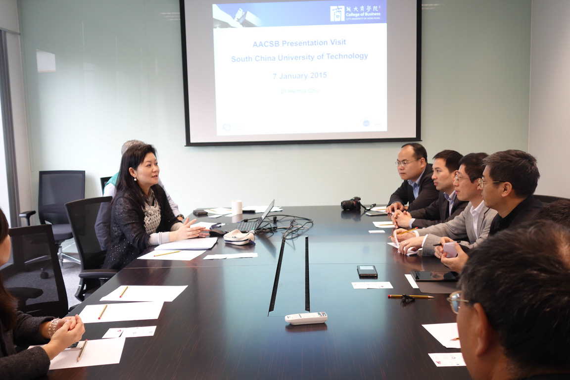 Mr Adams Chan, Systems Manager of the College, led a tour of the new CB labs, executive classrooms, and case rooms in Academic 3. After the campus tour, Dr Ron Kwok, Assistant Dean (Assurance of Learning), and Dr Hermia Chiu, College Secretary (Admin & Development) of the College, introduced the concept of assurance of learning and shared the accreditation experiences with the delegation respectively.