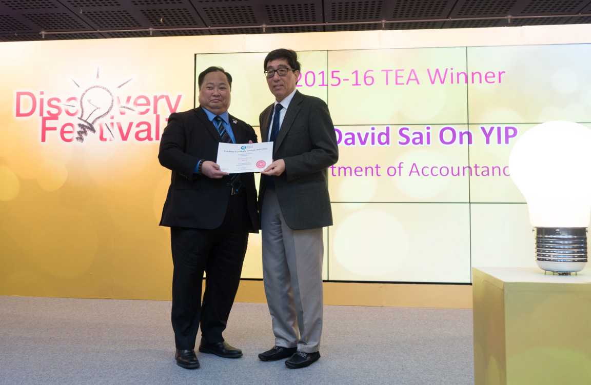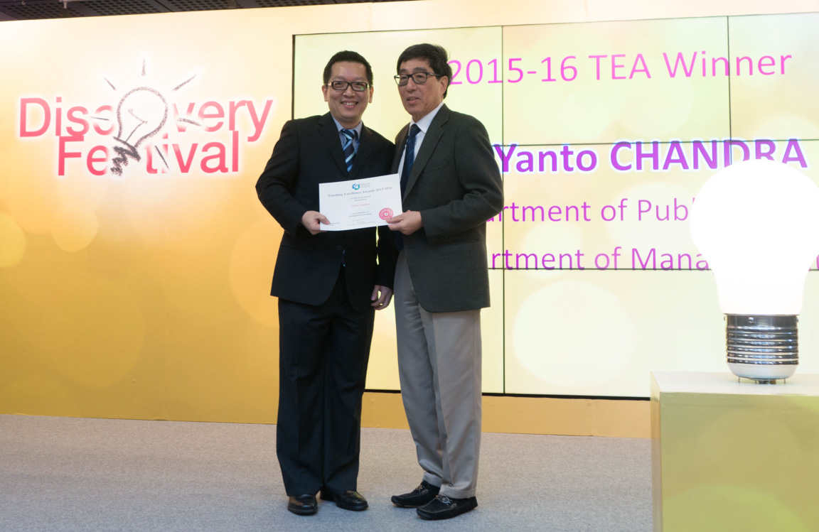 Dr Yanto Chandra, Assistant Professor of the Department of Management, and Mr David Yip, Senior Teaching Fellow of the Department of Accountancy, have received the prestigious 2015/2016 Teaching Excellence Awards (TEA) as recognition for their innovative teaching practice .