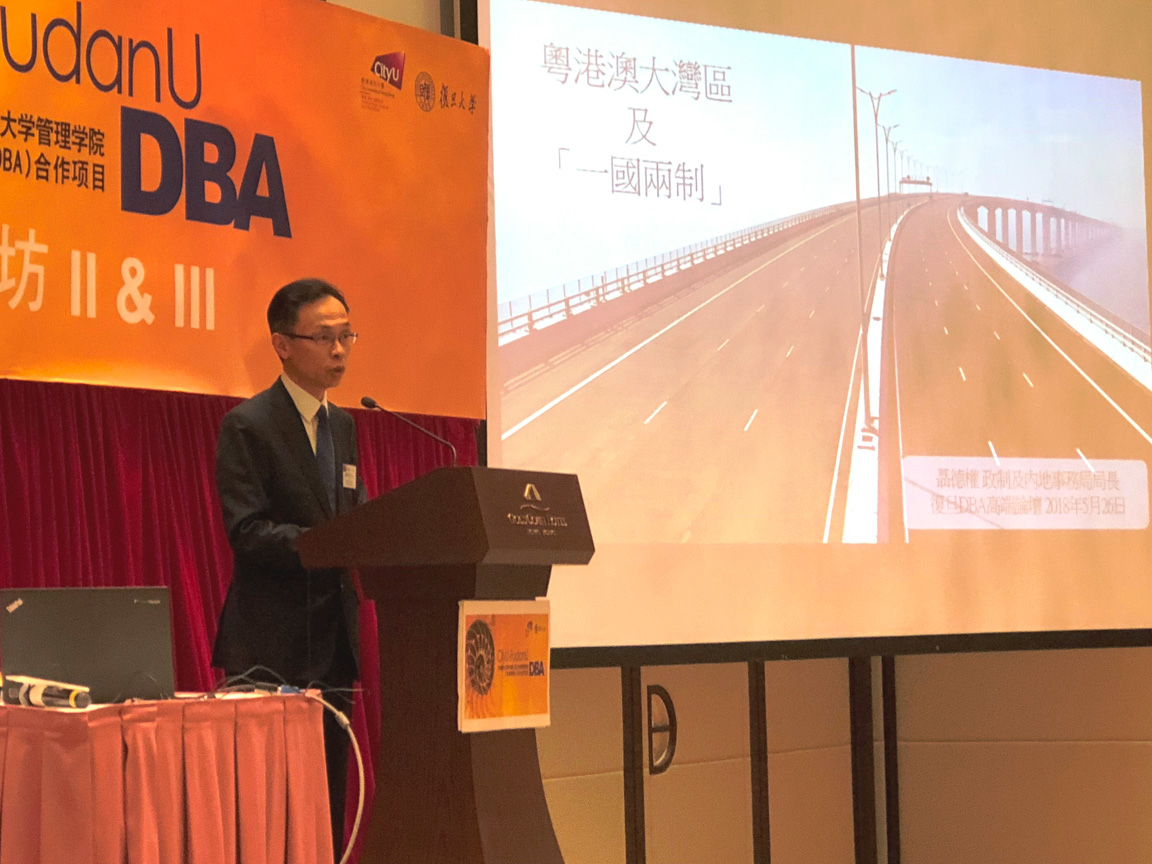 The Alumni Chapter of the CityU-FudanU Doctor of Business Administration (CityU-FudanU DBA) programme organised a seminar discussing the development of the Guangdong-Hong Kong-Macao Greater Bay Area and its relationship with the “One Country, Two Systems” policy in Hong Kong. Mr Patrick Nip Tak-kuen, JP, Secretary for Constitutional and Mainland Affairs, was invited to give a keynote speech.
