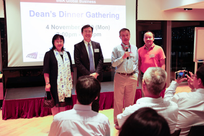 The College of Business hosted the annual dinner gathering for BBA Global Business (GBU) and BSc Computational Finance and Financial Technology (CFFT) students on 4 November. Over 100 students from various cohorts spent an enjoyable night with the College’s management team including Acting Dean Professor Houmin Yan, Associate Dean (Research and Faculty) Professor Weiquan Wang, Associate Dean (Undergraduate Programmes) Dr Raymond Wong, Associate Dean (Internationalisation) Dr Mary Pang , Head of Department of Economics and Finance Professor Yue Ma, Head of Department of Management Professor Jane Lu, Acting Head of Department of Marketing Professor David Li, CFFT programme leader Professor Tao Li and CFFT Deputy programme leader Dr Alvin Leung. Some other faculty members and staff from various business units also joined the gathering to understand better about students’ needs and to share tips for their studies.