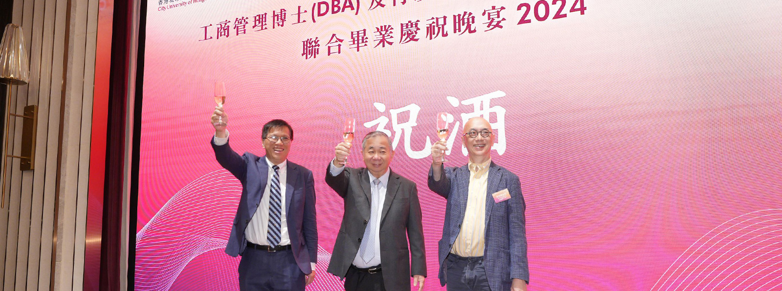 The College of Business held a joint graduation celebration dinner for over 200 students, faculty, and alumni from four Doctor of Business Administration (DBA) and Executive Master of Business Administration (EMBA) degree programmes on the evening of 15 June. Several distinguished guests attended the event, including Professor Freddy Boey, CityUHK President, Professor Robert Li Kwok-yiu, Associate Dean, Chow Yei Ching School of Graduate Studies, Professor Zhiwen Yin, Associate Dean of the School of Management at Fudan University, and Ms Anan Yang, Director of the Academic Affairs Office in the School of Public Policy and Management of Tsinghua University.